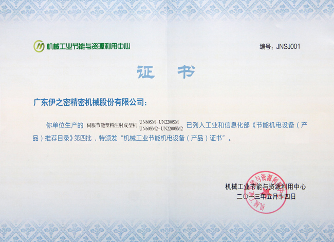 To further promote energy-efficient electromechanical equipment and accelerate closing down backward facilities, China’s Ministry of Industry and Technology Information entrusted Machinery Industry Energy and Resources Conservation Center with working out Catalog of A Fourth Batch of Recommended Energy-saving Electromechanical Equipment (Products) that was officially issued in recent days. YIZUMI SM series energy-saving injection molding machine (UN60SM-UN2200SM) and YIZUMI SM2 series servo injection molding machine (UN60SM2-UN2200SM2) were listed in the catalog and awarded the certificate of “Machinery Industry’s Energy-saving Electromechanical Equipment (Product)”.